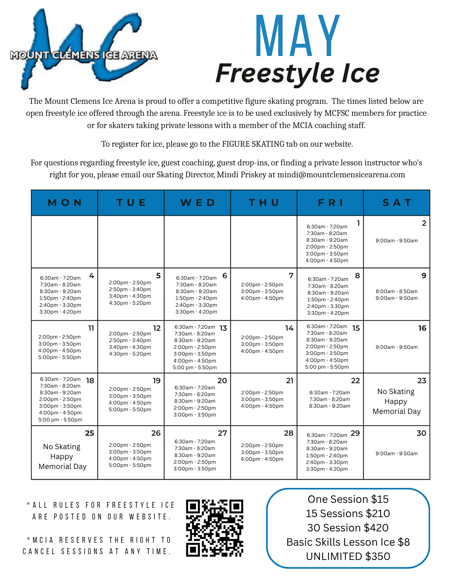 For questions regarding freestyle ice, guest drop-ins, guest coaching, or finding a private instructor, please email our Skating Director, Mindi Priskey at mindi@mountclemensicearena.com