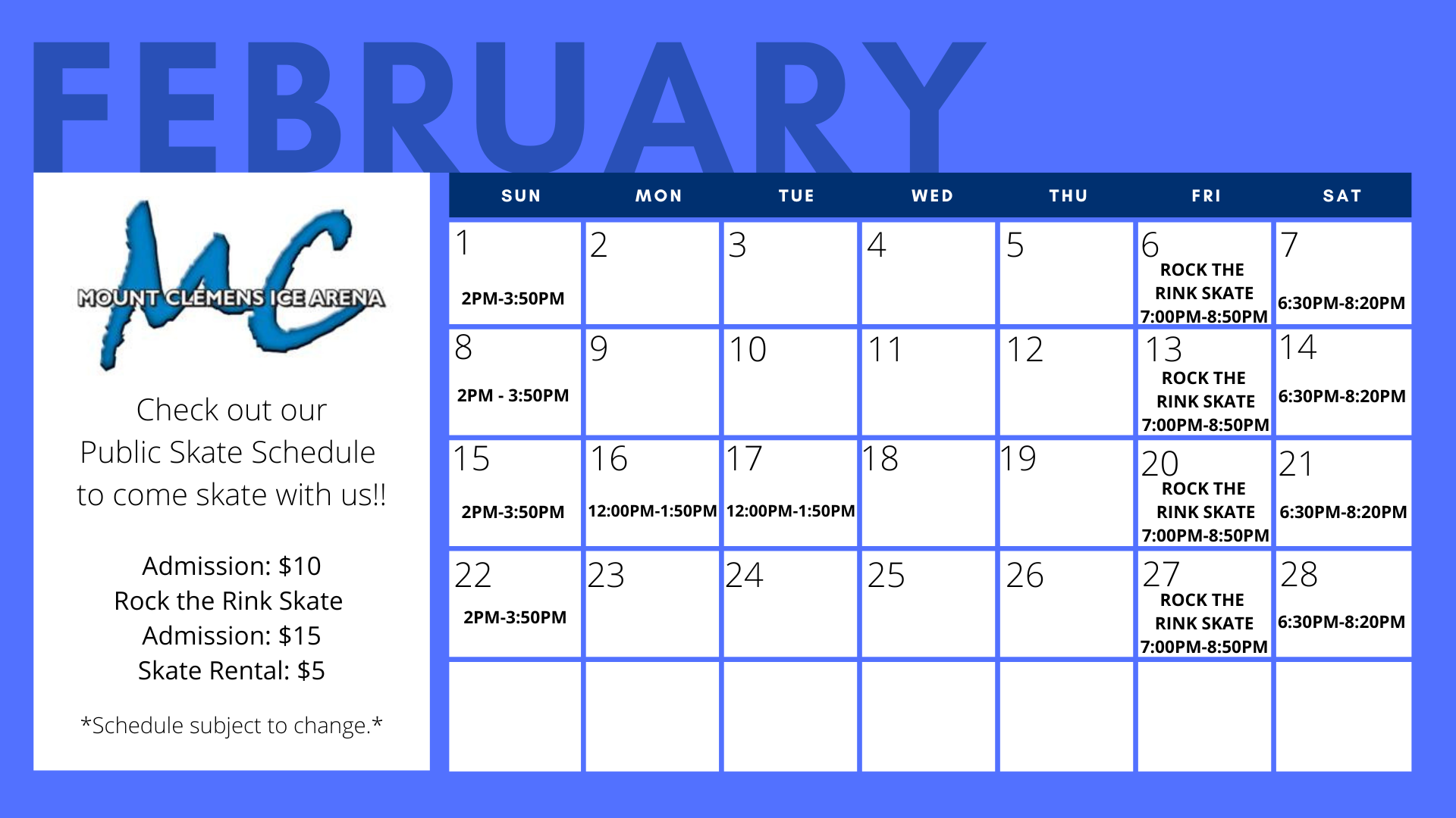 PRE-REGISTER FOR PUBLIC SKATING HERELace up the skates, hit the ice and see for yourself why ice skating at the Mount Clemens Ice Arena is one of the area’s favorite activities for people of all ages! Whether you are with friends, with family, on a date or just out for some exercise, ice skating is a great activity for all occasions. Budget-friendly and always fun, ice skating is great for all ages and experience levels, and a perfect addition to a healthy lifestyle. Because ice is slippery and injuries can happen, the arena recommends all skaters wear head protection, such as a hockey or bicycle helmet.